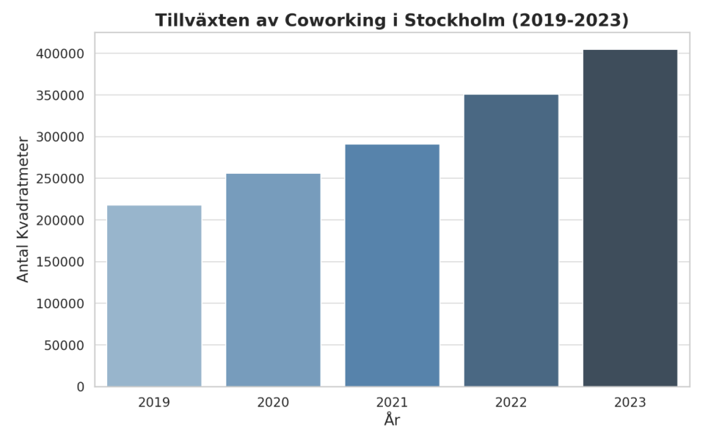 Utveckligen på Sveriges coworking spaces har varit blixtsnabb under de senaste åren och antalet kvadratmeter som ställts om till flexibla kontor har vuxit kraftigt. 2018 så fanns det 181 000 kvadratmeter coworking i Storstockholm och på 5 år har det mer än dubblats till över 400 000 m2. (Källa: Yta.se).